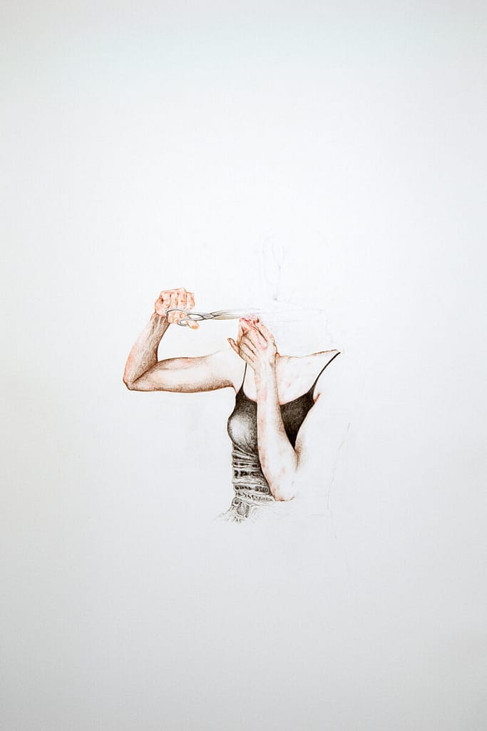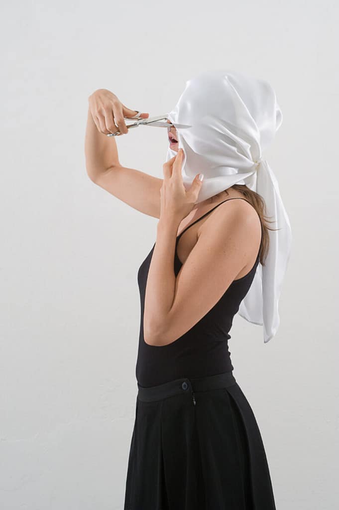 The Difference is a collaborative site-specific exhibition: the artists work together, blending their individualities with those of others, and collectively engage with the space to be set up (…). The theme is the liberation of the subject from clichés and mass-media stereotypes, from massified behaviors, and it serves as a critique of cultural and trendy conformisms, raising thought-provoking questions. The central core from which the entire project unfolds is the video A Hole Can Make A Difference by Roberta Cavallari and Caterina Curzola; the authors state: “A hole is a wound, an opening, a hole is what allows the flow of what has been held back, censored, concealed. A head wrapped in cloth, covering the senses and censoring the most powerful openings: eyes, mouth, ears. It is precisely the senses, blocked and hidden, that hold the words, which constitute the possibilities for a person to communicate”. The action, then, enacts the liberating gesture that tears apart the constraints and impositions that suppress subjectivity, the person in their physicality. The veil denies the somatic traits, hides them, neutralizes them in the normative and bureaucratic anonymity of convention. The performer tears the veil, tears the convention, contradicts the norm and its bureaucratic implementation (…). As the new identity is liberated, triangles of light burst from the hole-wound, pouring forcefully into the air, filling it with new energy.